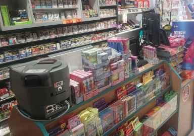 Lottoterminal, Fahrkartenterminal, Kaffeemaschine, Scannerkasse (Cloud-Lösung), diverse Regale für Tabak, Zeitschriften, Karten, usw. Der Bodenbelag ist Linoleum.